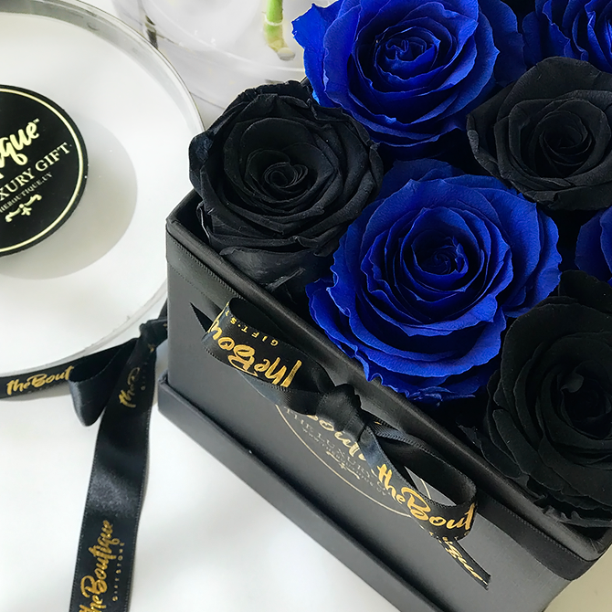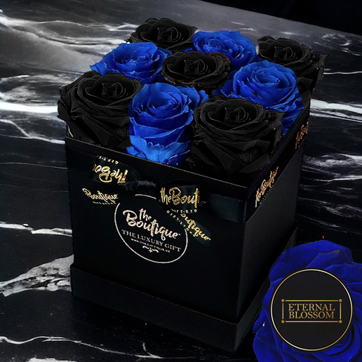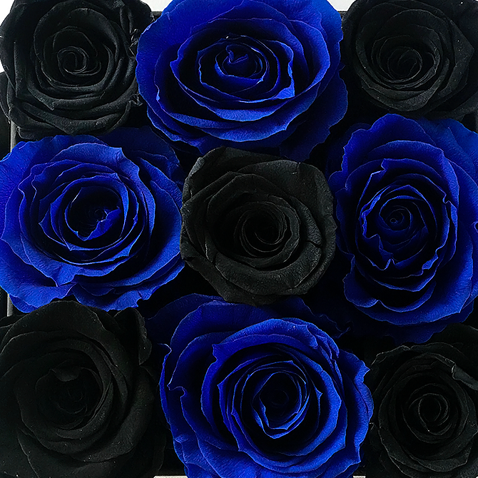 9 rosas preservadas en azules y negras.