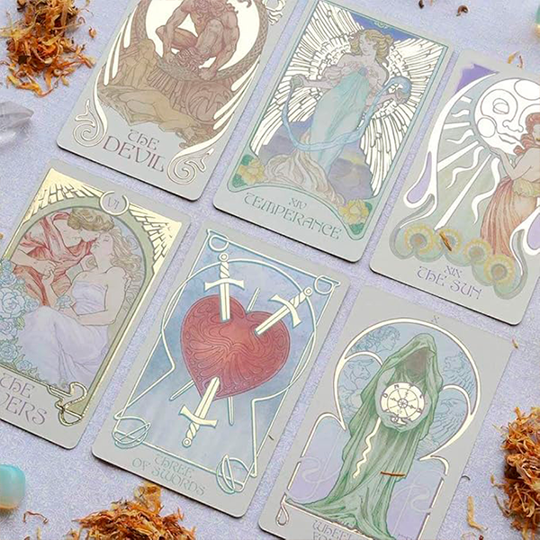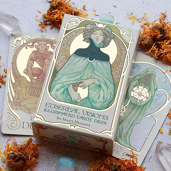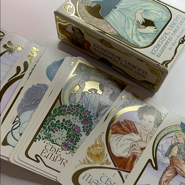 El tarot Ethereal Visions, Un tarot estampado en oro, y que se basa con unas ilustraciones preciosas en la época dorada del Art Noveau. Y este tarot además tiene la particularidad de contar con 2 cartas más.